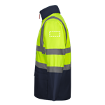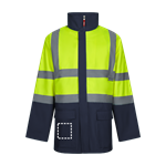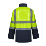 Parka 4 en 1 bicolore (180g/m²), en polyester (100%) avec finition PU. Quatre pièces en une : parka, imperméable, veste et gilet.Parka/ Imperméable : avec fermeture éclair centrale cachée avec patte de boutonnage qui se ferme par auto-agrippant, bandes réfléchissantes sur le torse, les épaules et les manches et capuche cachée , avec deux poches inférieures.Veste/gilet: avec fermeture éclair centrale, bandes réfléchissantes sur le torse et les épaules, poignets côtelés et manches amovibles. Trois poches (2 poches inférieures et 1 poche intérieure). Produit conforme au règlement (UE) 2016/425, certifié par EN20471 et classe Nº 2. Taille: S, M, L, XL, 2XL, 3XL