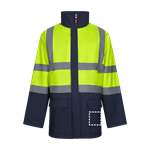 Parka 4 en 1 bicolore (180g/m²), en polyester (100%) avec finition PU. Quatre pièces en une : parka, imperméable, veste et gilet. Parka/ Imperméable : avec fermeture éclair centrale cachée avec patte de boutonnage, qui se ferme par auto-agrippant, bandes réfléchissantes sur le torse, les épaules et les manches et capuche cachée , avec deux poches inférieures. Veste/ gilet : avec fermeture éclair centrale, bandes réfléchissantes sur le torse et les épaules, poignets côtelés et manches amovibles. Trois poches (2 poches inférieures et 1 poche intérieure). Produit conforme au règlement (UE) 2016/425, certifié par EN20471 et classe Nº 2. Taille: 4XL,5XL