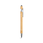 Stylo à bille en bambou avec détails en aluminium chromé. Il est doté d'un clip, d'une pointe tactile à l'extrémité et d'une écriture bleue. Le produit étant fabriqué à partir de matériaux naturels, la couleur du produit ainsi que le résultat de l'impression peuvent varier d'un produit à l'autre. ø11 x 150 mm