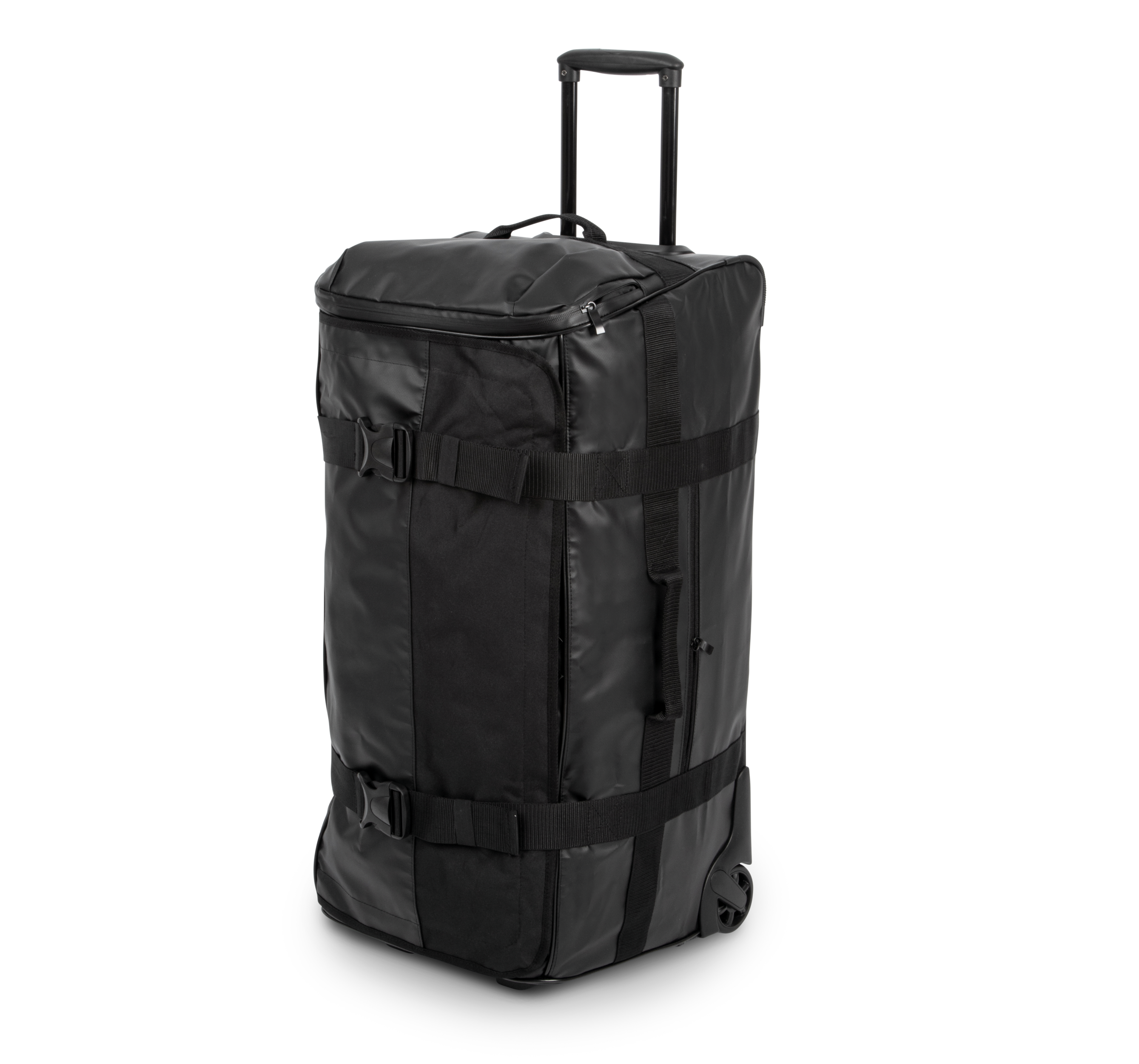 100% polyester / 100% PVC. Sac trolley grand format en chlorure de polyvinyle et polyester. Il est entièrement conçu en matériaux imperméables avec une fermeture glissière étanche. Pratique, il est composé d'1 poche range-chaussures sur le côté, d'1 poche frontale zippée, d'1 grande poche interne en filet pour accessoires avec fermeture zippée. Pour faciliter le transport, il est équipé de 2 sangles de compression, de poignées sur les 2 côtés. Robuste, ce sac a été pensé avec des renforts de protection sur les angles, 1 barre de protection sur le dos du trolley, 1 fond semi-rigide avec 1 poignée en plastique qui fait office de pied.Totalement imperméable.Doté de nombreuses poches et accessoires de rangement.Robustesse et protection renforcée.