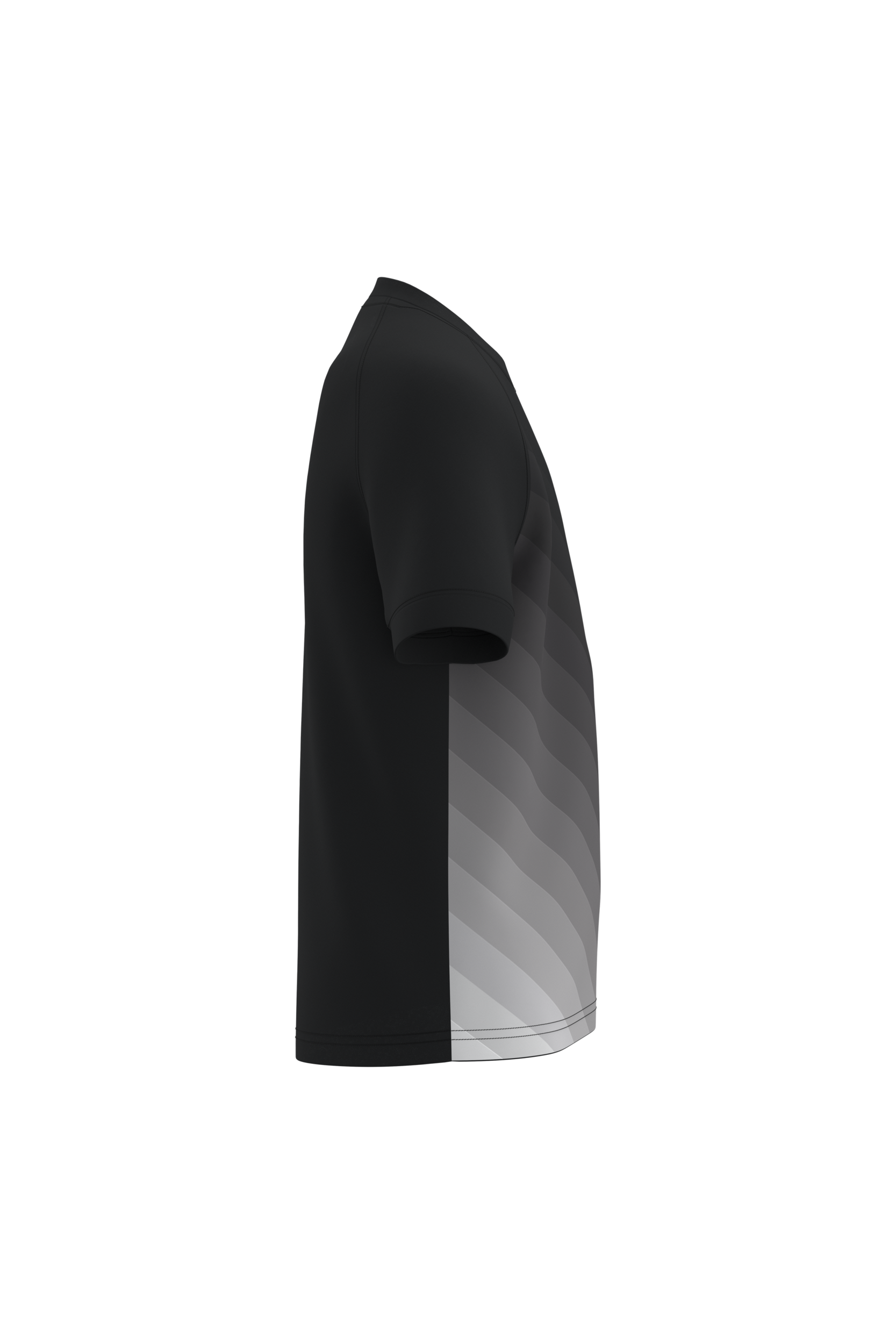 100 % polyester. Maille micro interlock. Traitement antistatique. Tissu léger, à séchage rapide. Lavable à 30 °C. Coupe droite. Devant sublimé avec un motif géométrique en dégradé. Col, manches et dos en tissu uni. Matière très légère et confortable, facilitant les mouvements. Col rond. et bas de manches en tissu principal. Manches raglan. Ourlet à double aiguille au bas du vêtement. Étiquette de marque détachable.140 g/m²