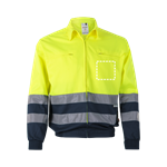 Veste en sergé bicolore (210g/m²) en polyester (80%) et coton (20%). Fermeture éclair centrale, ceinture latérale élastiquée et poignets côtelés. Bandes réfléchissantes sur le torse et les manches et deux poches poitrine avec fermeture éclair. Produit conforme au règlement (UE) 2016/425, certifié par EN20471 et classe Nº 2. Taille: S, M, L, XL, 2XL, 3XL