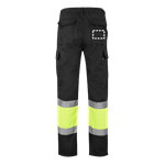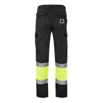 Pantalon bicolore en sergé, multipoches (210g/m²), en coton (20%) et polyester (80%). Avec ceinture élastique et bandes réfléchissantes sur le bas du pantalon. Contient six poches (2 poches françaises, 2 poches latérales à soufflet et 2 poches arrière à soufflet). Produit conforme au règlement (UE) 2016/425, certifié par EN20471 et classe Nº 1. Taille: S,M,L,XL,2XL,3XL