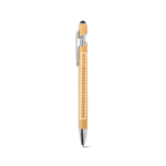 Stylo à bille en bambou avec détails en aluminium chromé. Il est doté d'un clip, d'une pointe tactile à l'extrémité et d'une écriture bleue. Le produit étant fabriqué à partir de matériaux naturels, la couleur du produit ainsi que le résultat de l'impression peuvent varier d'un produit à l'autre. ø11 x 150 mm