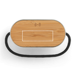 Enceinte portable fabriquée en bambou et en PET recyclé (100 % rPET), avec un chargeur sans fil ultrarapide sur le dessus. Grâce à la transmission sans fil BT 5'3 et au chargement sans fil d'une puissance maximale de 15 W, il permet un chargement ultrarapide. Avec une puissance sonore de 5 W et une batterie de 1 200 mAh, il dispose d'une autonomie d'environ 2 heures. Compatible avec les appareils mobiles dotés de la technologie de charge sans fil. Comprend un câble de charge USB-C. Fourni dans une boîte cadeau en papier kraft. Le produit étant fabriqué à partir de matériaux naturels, la couleur du produit ainsi que le résultat de l'impression peuvent varier d'un produit à l'autre. 120 x 100 x 60 mm | Coffret: 124 x 114 x 64 mm