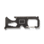 Carte multifonction en acier inoxydable. Comprend 8 fonctions: scie, coupe-câble, clé, tournevis, tournevis cruciforme, règle graduée, décapsuleur et porte-clés. 80 x 30 mm