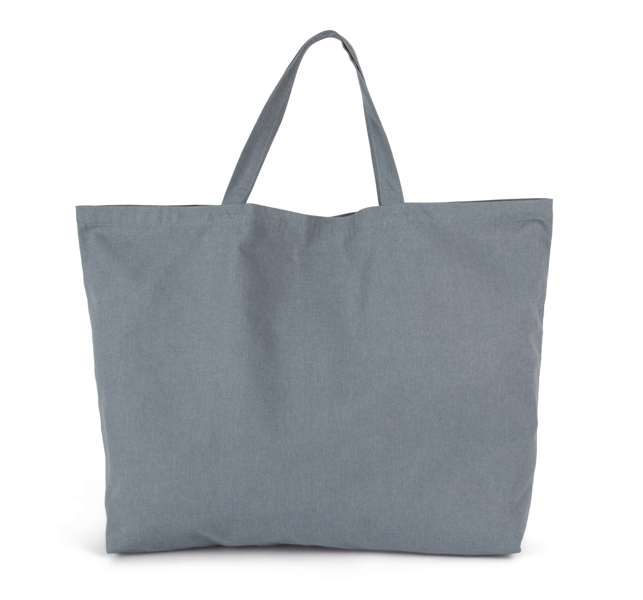 Coton recyclé / polyester recyclé. Très grand sac shopping avec poignées du même tissu que le sac. Ce sac fait partie du projet "K-loop". À travers ce projet, Kimood ferme la boucle de l’économie circulaire au sens strict. Le coton utilisé provient en effet des déchets de fabrication des articles en coton de la marque Kariban, et de la gamme KARIBAN BRANDS. Le polyester ajouté est issu du recyclage de bouteilles plastique en PET. Durant le processus de recyclage, des traceurs sont ajoutés au fil, à savoir des filaments en viscose et céramique qui font office d’empreinte digitale unique. Les traceurs réfléchissent la lumière de façon unique, et portent donc un code univoque et inviolable. Grâce à cela, nous pouvons donc mémoriser dans une chaîne de blockchain, toutes les informations des processus auxquels le fil a été soumis de façon univoque. Grâce à la technologie des traceurs Aware™ et à la plate-forme correspondante de blockchain, Kimood permet au consommateur final de suivre l’ensemble du processus de production. Cela permet de garantir que le produit a bien été recyclé en utilisant ses propres déchets, sans altérations possibles du processus. Une étiquette spéciale avec un QR code permet d’accéder à la plate-forme Aware™ et d’authentifier directement les certifications via un simple smartphone.Sac shopping XL durable, conçu à partir de coton recyclé et de polyester recyclé.Sac grand format résistant.Ce sac fait partie du projet "K-loop".285 g/m²