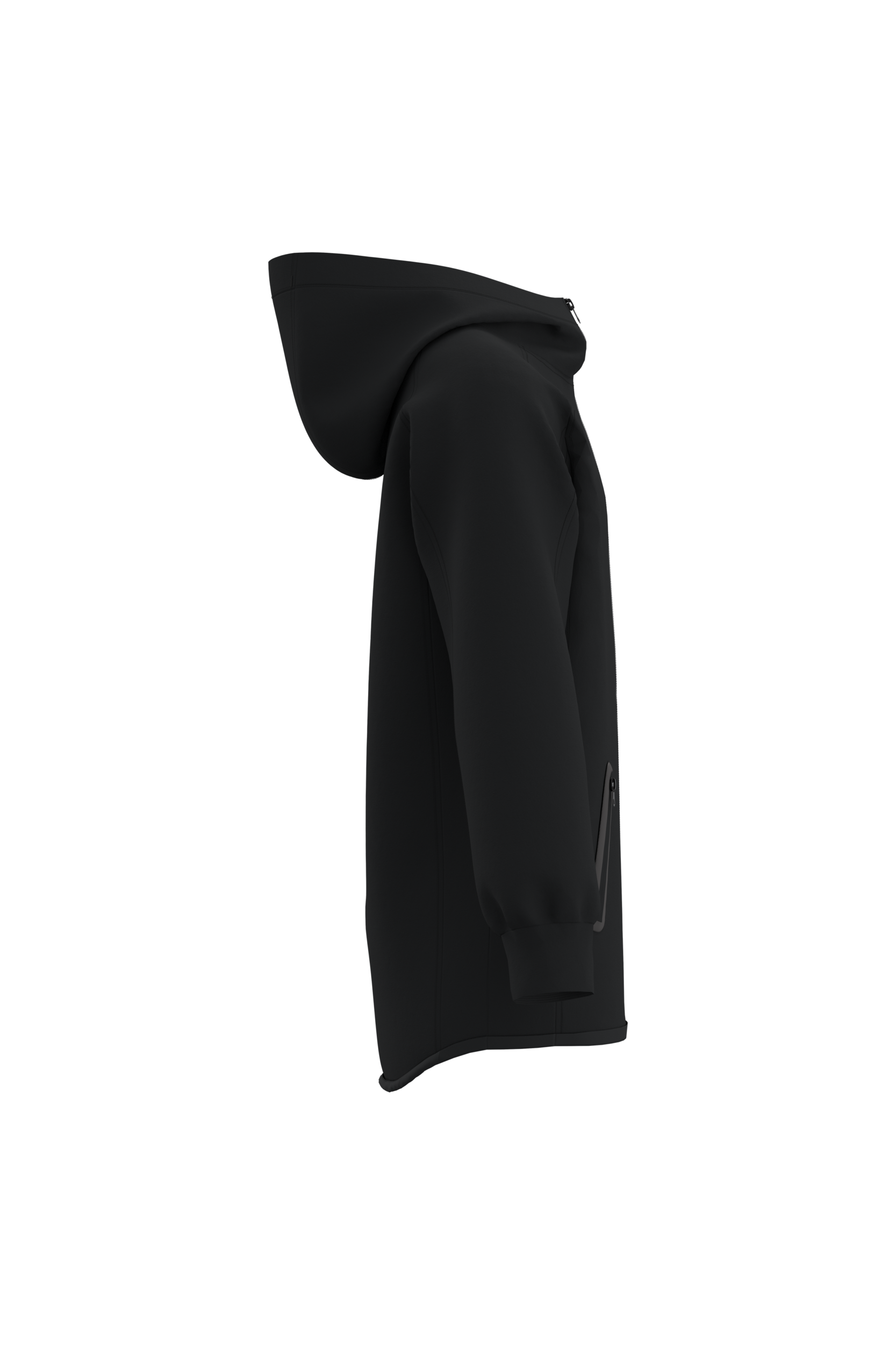 94% polyester / 6% élasthanne (79% polyester / 15% viscose / 6% élasthanne pour le coloris chiné). Coupe droite. Matière ultra confortable. Fermeture zippée. 2 poches avant zippées avec finition thermosoudée. Capuche doublée en jersey (65% polyester / 35% viscose). Bas de manches resserrés avec une partie élastiquée contrastée et bas de vêtement finition biais contrasté. Fermeture contrastée. Parties contrastées Black sur tous les coloris et Dark Grey sur le Ash Heather.310 g/m²