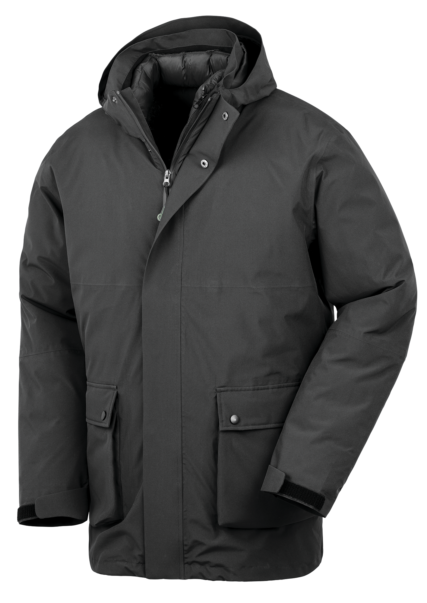 Tissu extérieur en polyester ripstop recyclé avec membrane TPU et doublure 100 % polyester recyclé. Rembourrage de la doudoune : 280 g/m² de duvet synthétique recyclé. Imperméabilité 3000 mm et respirabilité 1000 MVP. Veste technique 3 en 1 composée d’une veste imperméable et d’une doudoune intérieure amovible, pouvant être portées ensemble ou séparément selon les conditions. Veste extérieure : capuche amovible et réglable, fermetures zippées imperméables, poches multiples, aérations sous les aisselles, manches ajustables, coutures soudées. Doudoune intérieure : fermeture zippée, ourlets et poignets élastiqués, tissu doux et léger.Doudoune avec une imperméabilité de 3000 mm et une respirabilité de 1000 MVP.Veste technique 3 en 1 composée d’une veste imperméable et d’une doudoune intérieure amovible.280 g/m²
